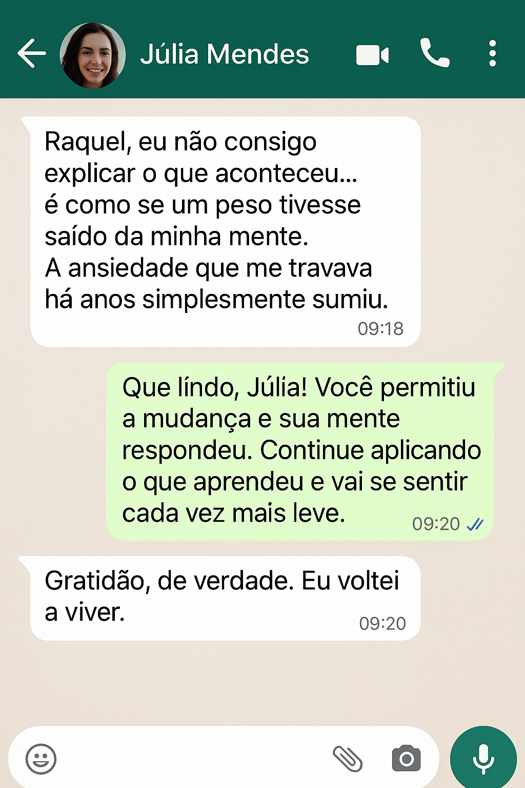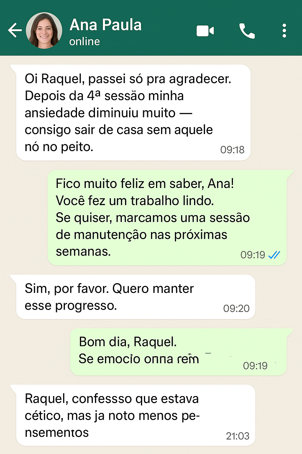 ✨ Protocolo Personalizado: Criarei um tratamento exclusivo para você, eliminando ansiedade, medo e estresse, e fortalecendo sua mente para viver leve, focado e equilibrado.