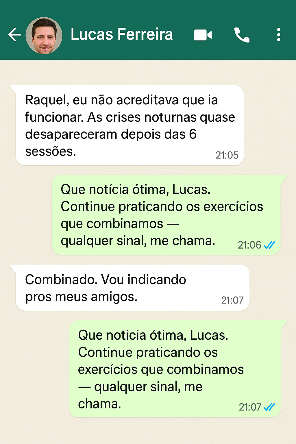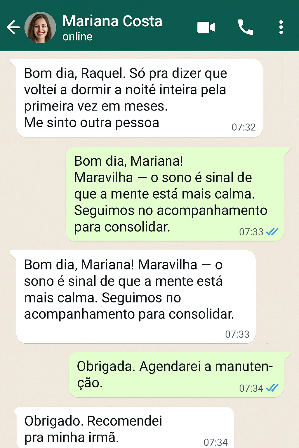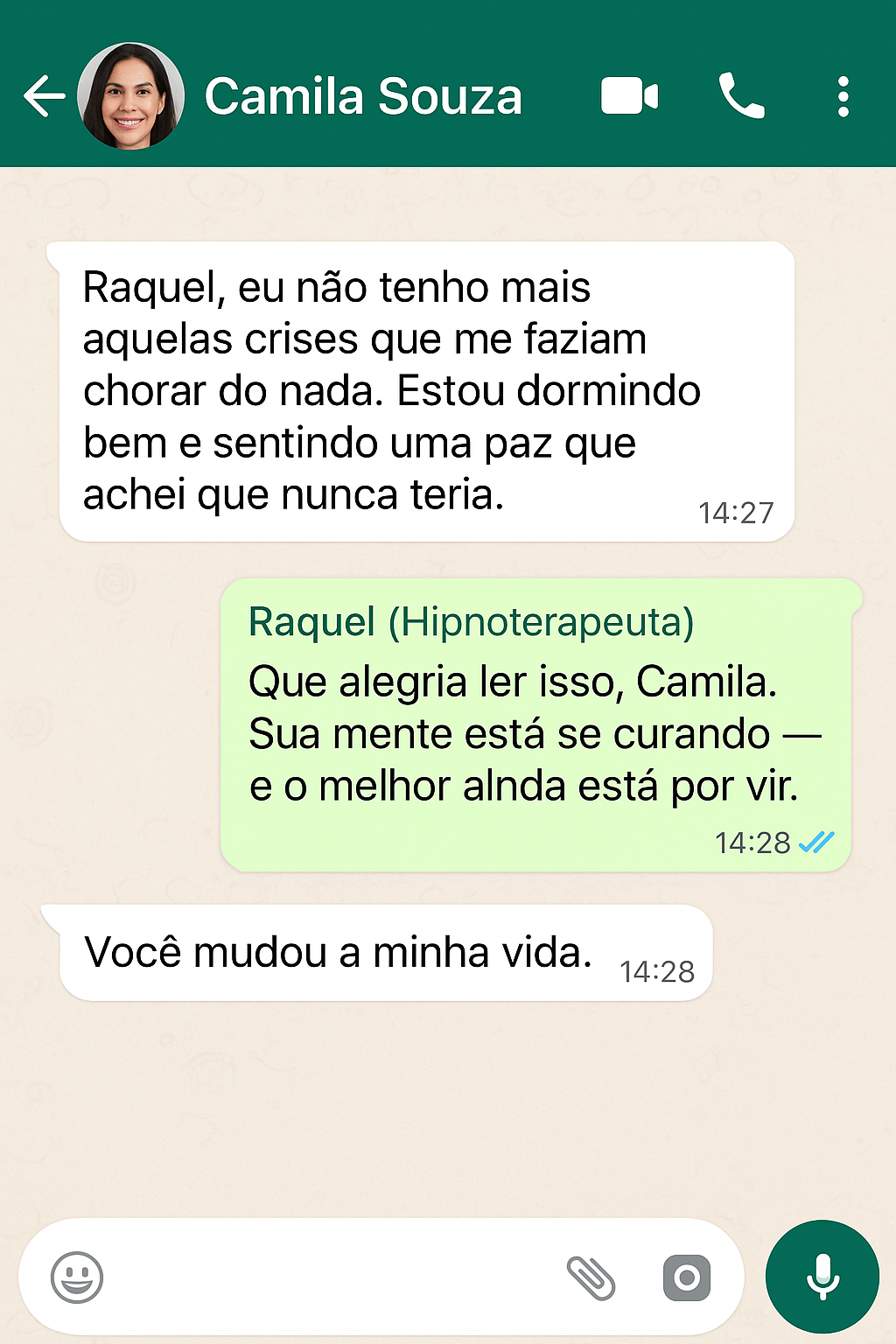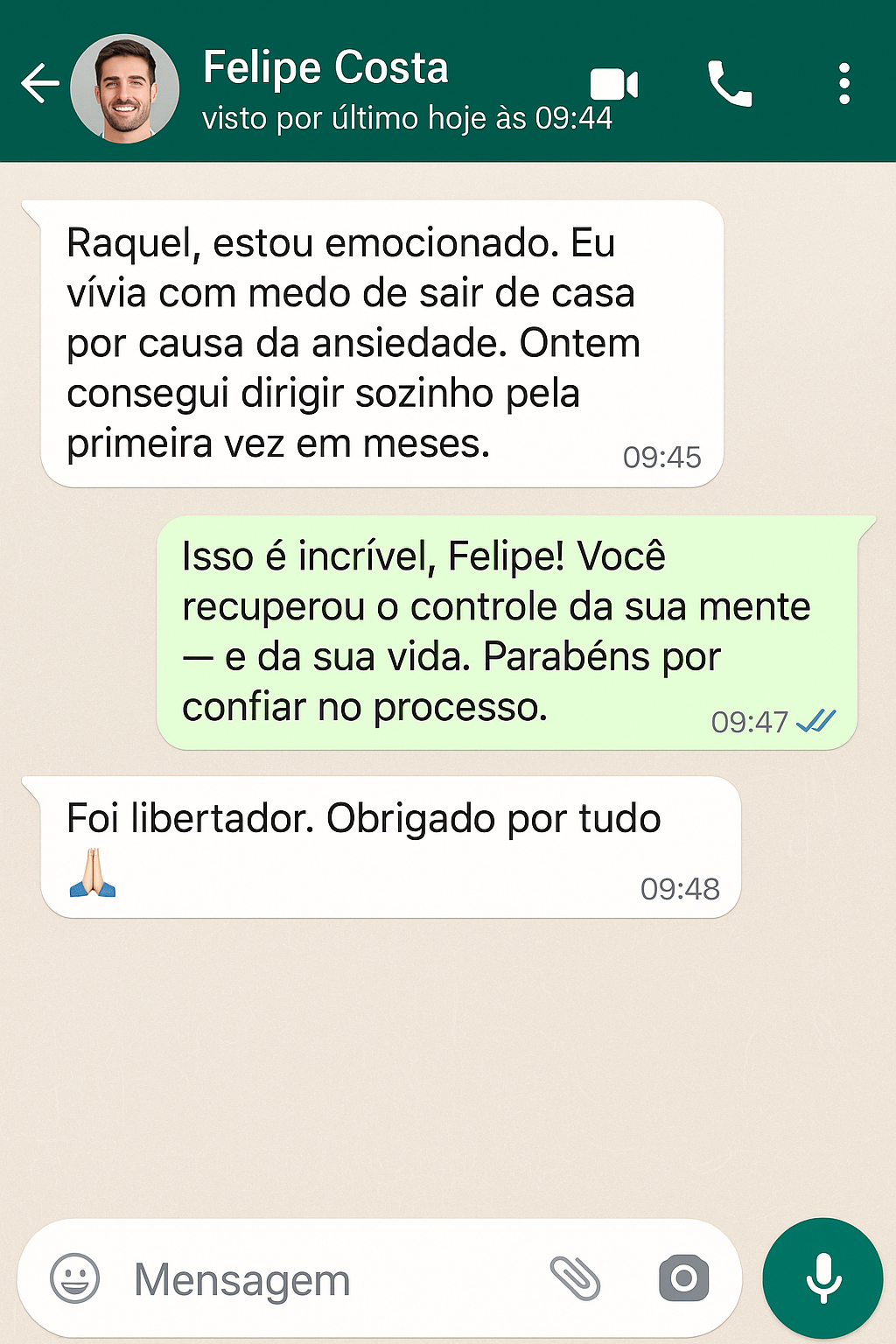 “Já tinha tentado de tudo pra controlar a ansiedade, mas nada funcionava. A hipnoterapia foi o que realmente fez minha mente ‘destravar’. Hoje durmo bem e consigo ter foco no trabalho!”